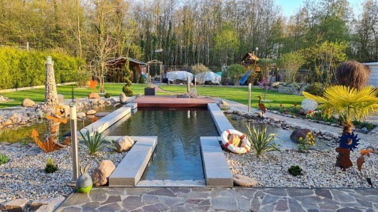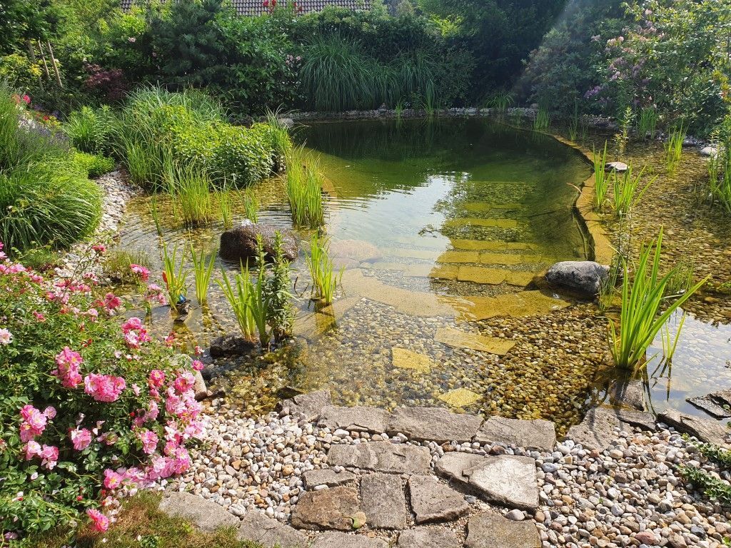 Besonderheiten: Der Naturpool, im Nutzungsbereich sind keine Pflanzen. Wasseraufbereitung erfolgt in einem separaten Filter (auch ohne Pflanzen möglich).