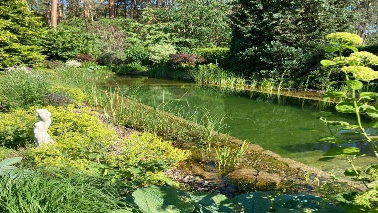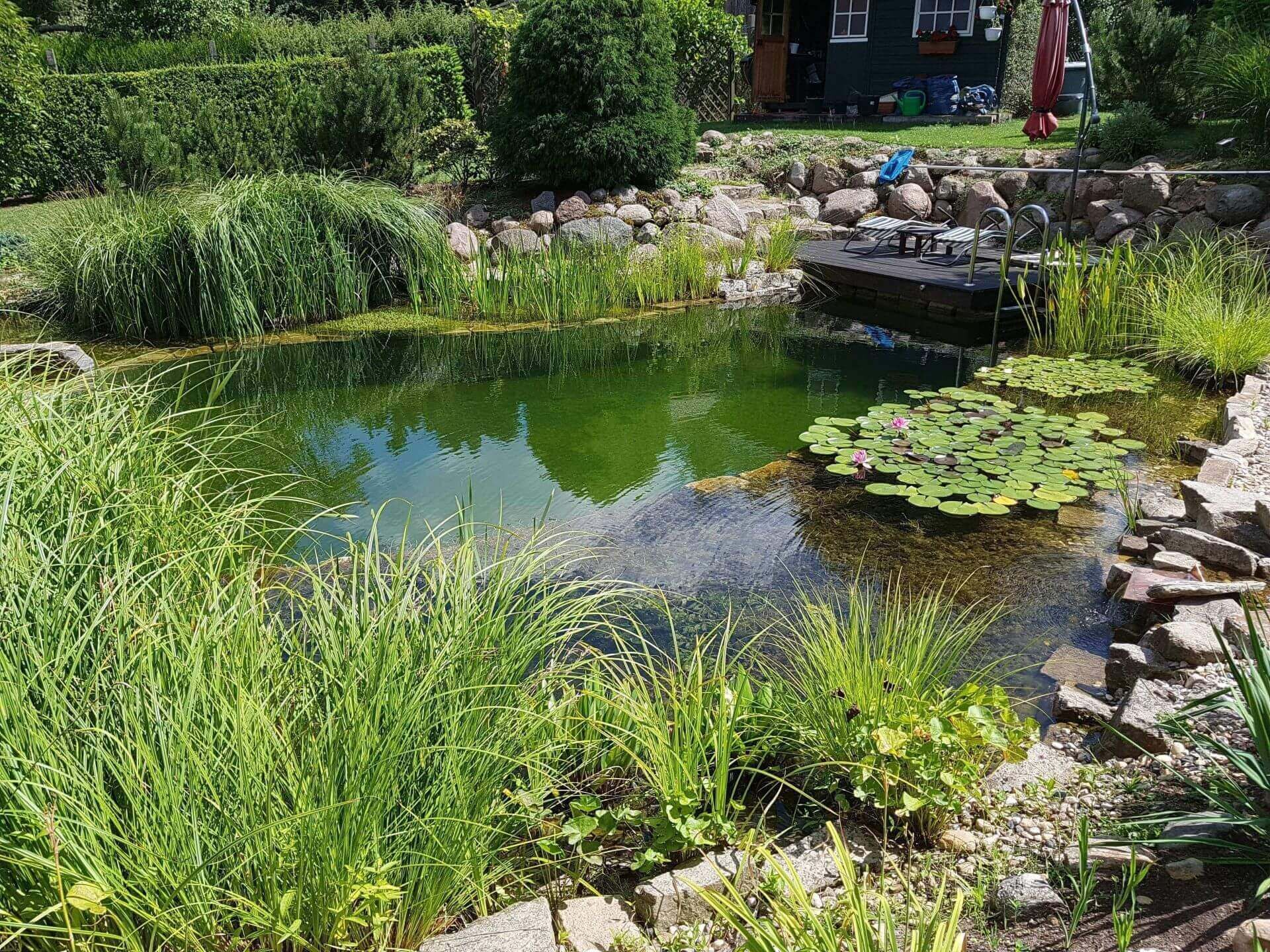 Natürlicher geht es wohl kaum, ein Teich komplett ohne Technik. Als Schwimmteich nur bedingt geeignet.
